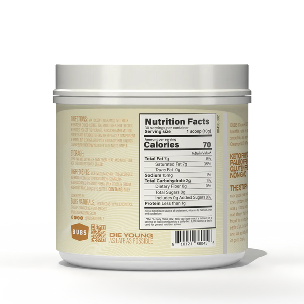 BUBS Butter MCT Oil Creamer is your go-to for clean, fast-acting energy and focus, no crash included. It blends creamy grass-fed butter with fast-acting MCT oil powder (C8 and C10) to kickstart your day and keep you sharp. The MCTs go straight to work, giving your brain a quick boost while the grass-fed butter supports digestion and gut health.