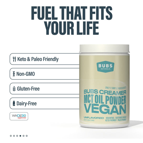 It’s no secret that we here at BUBS Naturals prefer the MCT Oil Powder over the MCT Oil. BUBS MCT Oil Powder is made from MCT Oil extracted from 100% sustainably sourced virgin coconut oil, which is then spray dried into a powder. The MCT Oil Powder is a portable and convenient way to add MCT Oil to your diet, and can easily be mixed into smoothies, coffee, or even baked goods, giving you a rich and smooth texture, without ever tasting “fatty”.